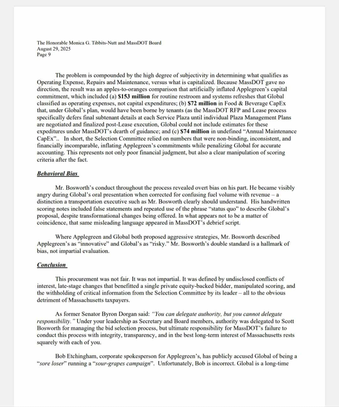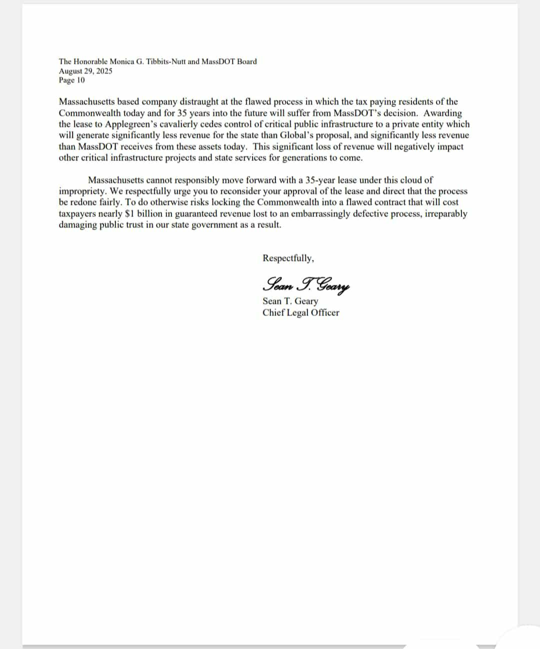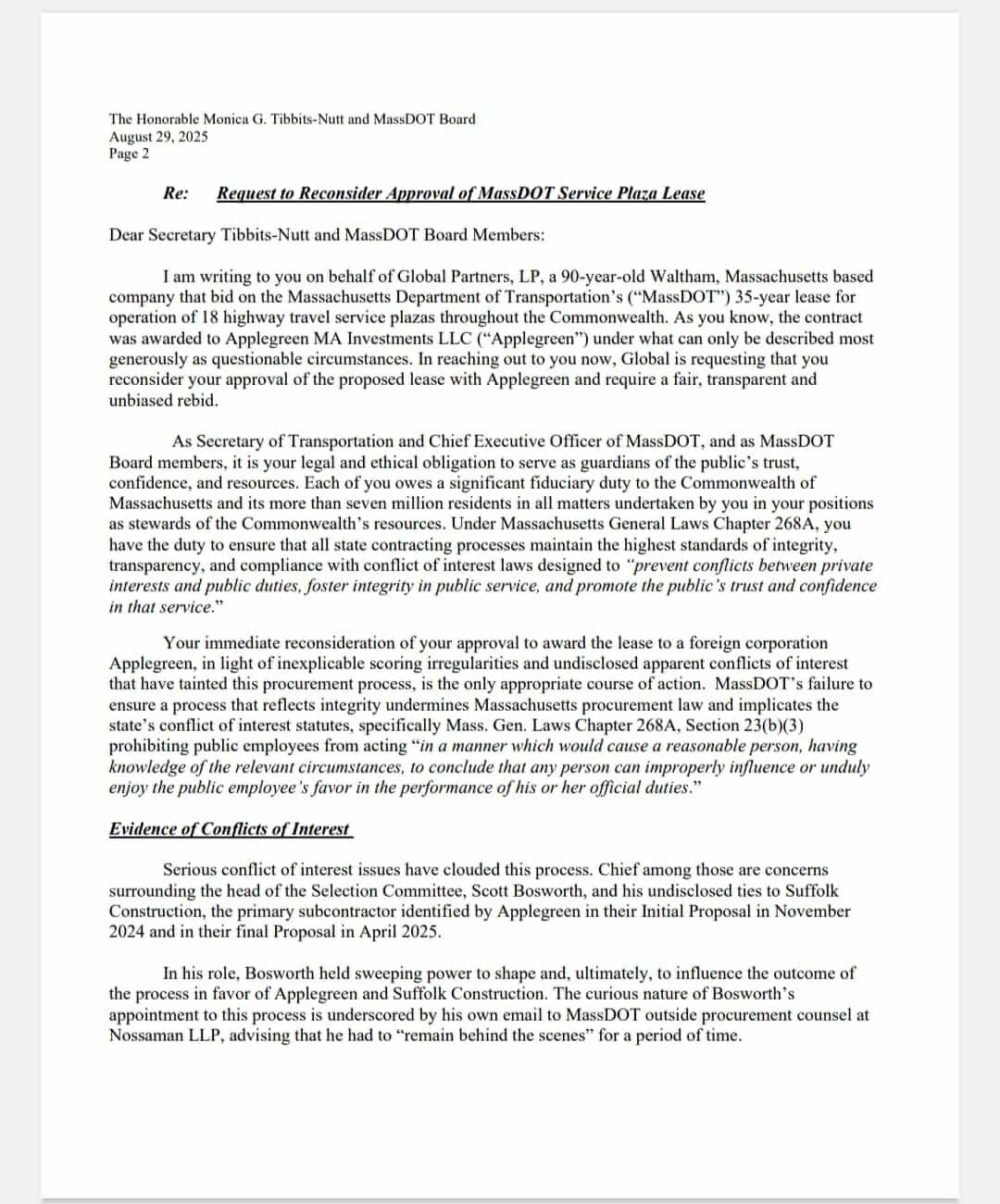 Waltham, MA based Global Partners has sent a letter to the Massachusetts Department of Transportation and its Board of Directors asking they reconsider the contract awarded to foreign company Applegreen for the lease and operation of 18 service plazas throughout the state. They specifically ask for a "fair, transparent and unbiased rebid."