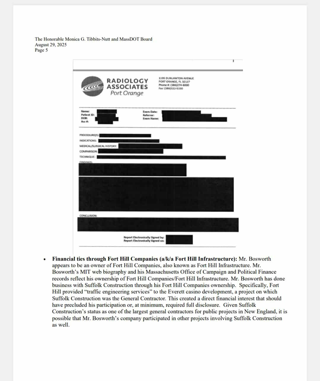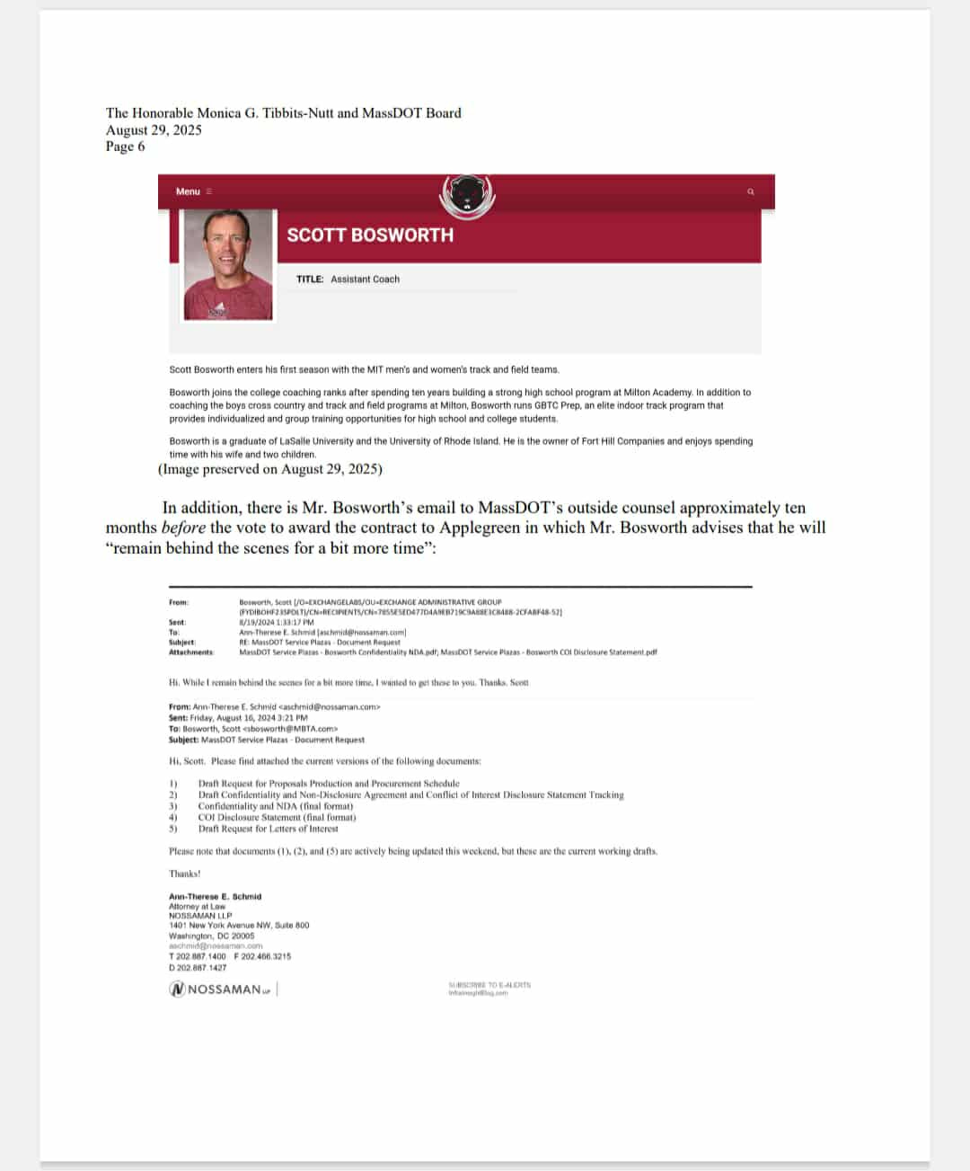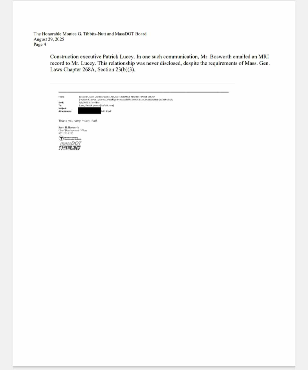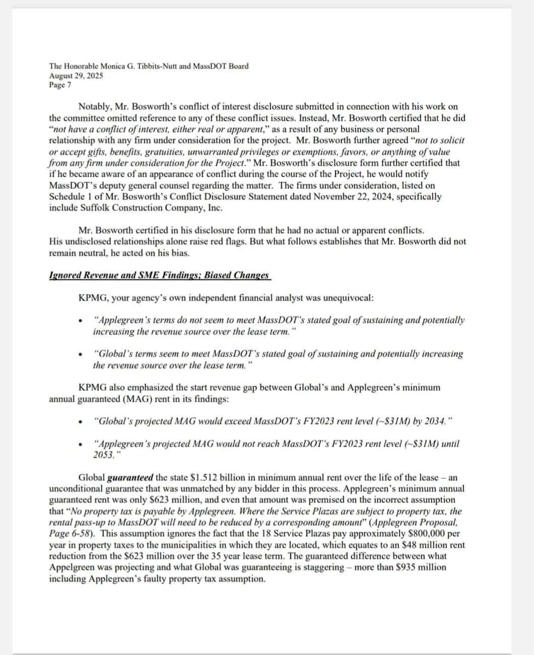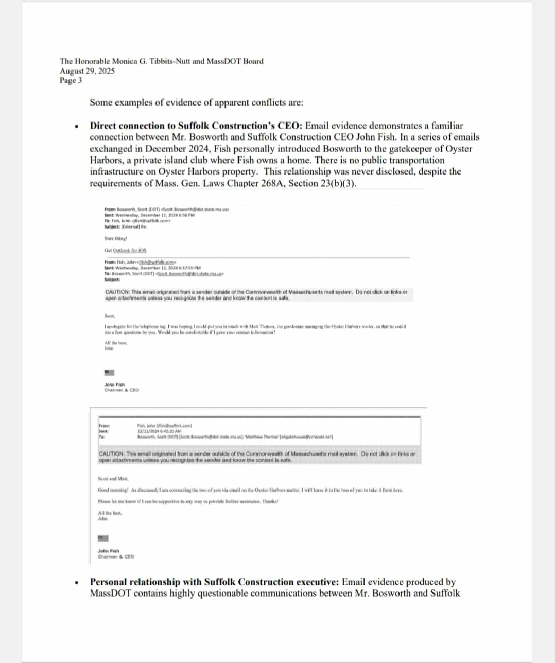 The letter states there is evidence of a conflict of interest, specifically naming head of the selection committee, Scott Bosworth and his connection to Suffolk Construction CEO John Fish.